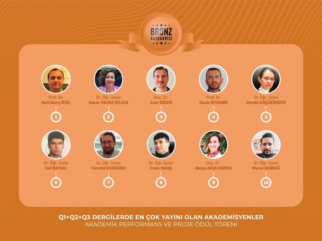 Bölümümüz Öğretim üyelerinden Doç. Dr. Ahmet CAN Gümüş kategoride (Q1+Q2 dergilerde en çok yayını olan akademisyenler) birinci, Doç. Dr. Eser SÖZEN Bronz kategoride (Q1+Q2+Q3 dergilerde en çok yayını olan akademisyenler) üçüncü ve Prof. Dr. Deniz AYDEMİR Bronz kategoride (Q1+Q2+Q3 dergilerde en çok yayını olan akademisyenler) dördüncü olarak, başarı belgelerini Bartın Üniversitesi Rektörü Prof. Dr. Orhan UZUN’un elinden aldılar. Hocalarımızı tebrik eder başarılarının devamını dileriz.